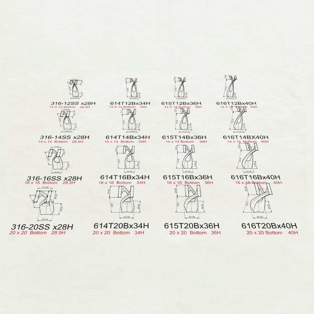 | Dimension | 12" L x 12" W x 34" H | 14" L x 14" W x 34" H | 16" L x 16" W x 34" H | 20" L x 20" W x 34" H |